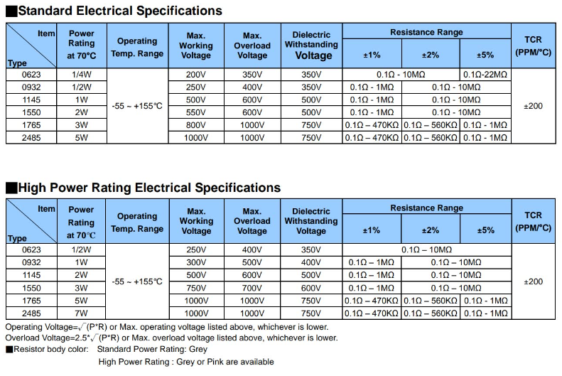 | Metal Oxide Leaded Film Resistor 插件式金屬氧化皮膜電阻 | MOF | ![]() | 0.1Ω~22MΩ | ±1%,±2%,±5% | 200 | 0623/0932/1145 1550/1765/2485 |